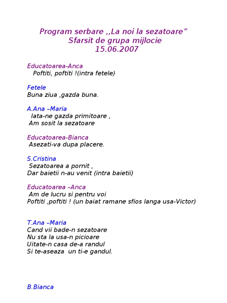 Program Se Serbare Sfarsit De An Scolar Grupa Mijlocie I